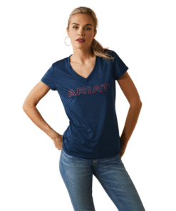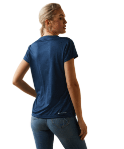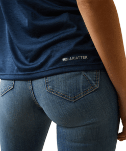 Laguna Logo Short Sleeve Top är en sportig V-ringad T-shirt från Ariat tillverkad i modern AriatTEK® -funktionsmaterial vars syfte är att hålla dej sval när det är varmt. Du tvättar din AriatTEK® – top på låg temperatur utan sköljmedel, om du vill stryka eller tumla så använd låg temperatur och tvätta bara när det behövs. 100% polyester, plagget är tillverkat i Kina.