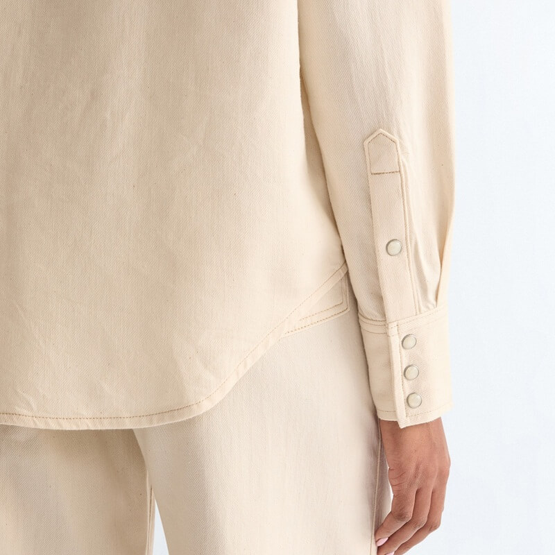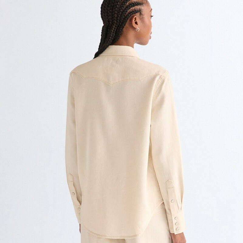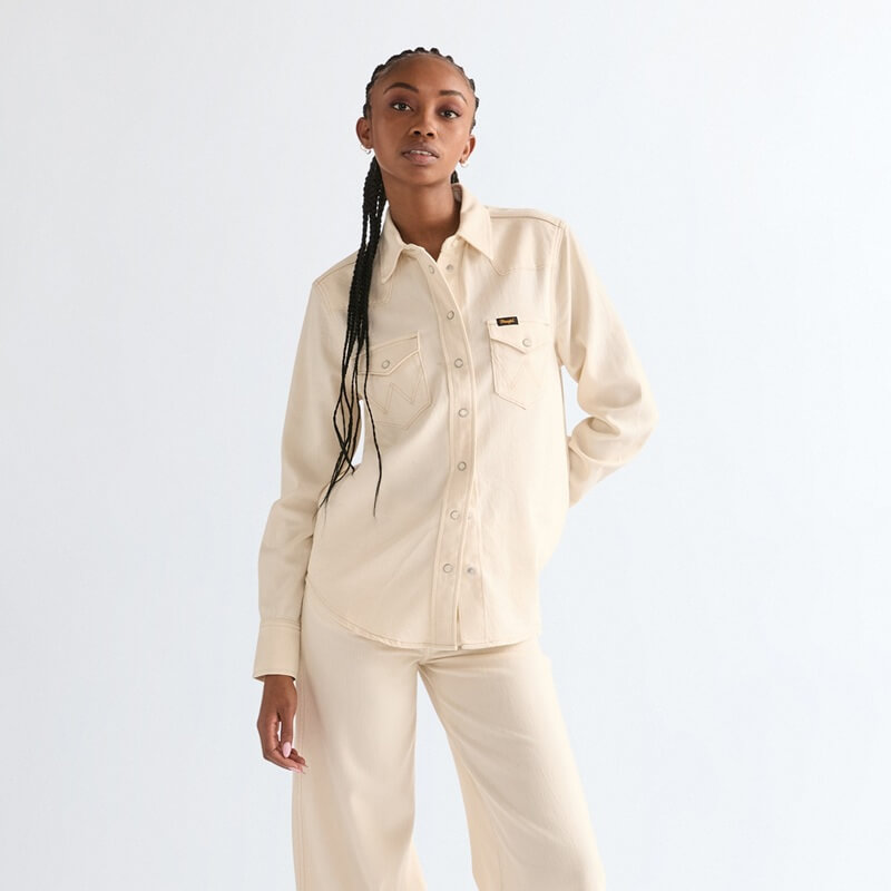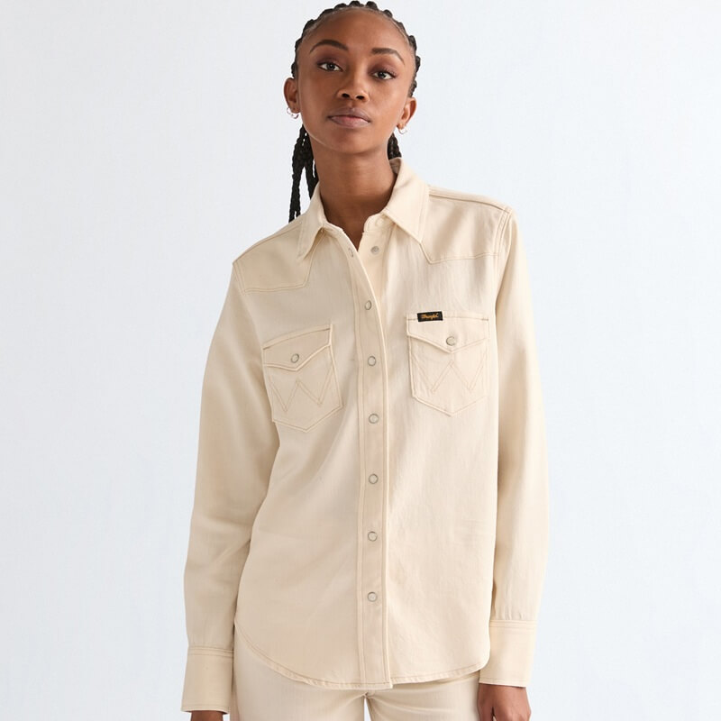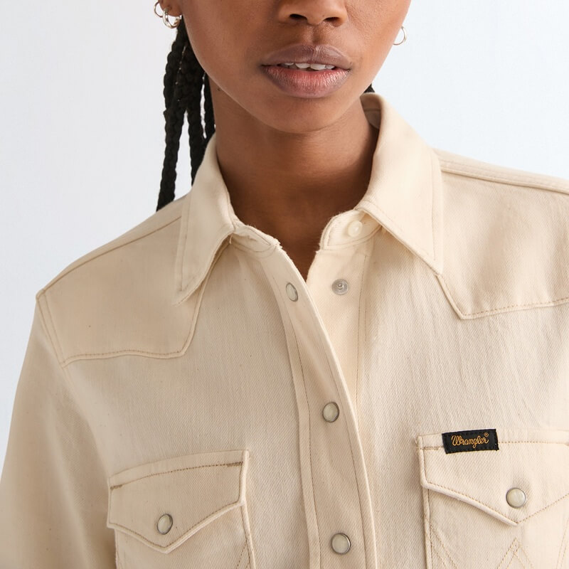 Wrangler jeansskjorta i naturfärgad bomull har de autentiska westerndetaljerna som du älskar! En modern jeansskjorta som är en tolkning av en cowboyklassiker. Om det finns en jeansskjorta du behöver i ditt sortiment den här säsongen, så är det den här Wrangler-skjortan. Denna långärmade skjorta med beprövade westerndetaljer, erbjuder en vintage cowgirl-stil som är enkel att styla med dina favoritjeans från Wrangler. Dessutom gör det lätta materialet den perfekt för de varmare månaderna. Normal passform som inte är för tajt eller lös ger maximal komfort. Tillverkad av en blandning av bomull, lyocell och stretch som faller vackert och ger komfort hela dagen. Den har tryckknappar framtill, två bröstfickor med tryckknappar, justerbara manschetter med tryckknappar, signatur-W-sömmar. Plagget är tillverkat i Bangladesh