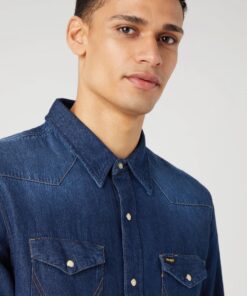 Wrangler jeansskjorta i mörk stentvätt är en tidlösa jeansskjortan med normal passform av mjuk denim, 100% bomull. Skjortan har autentiska detaljer som western-ok, spetsig krage och tryckknappar. Det finns dubbla bröstfickor med lock och klassisk Wranglerlogotyp.